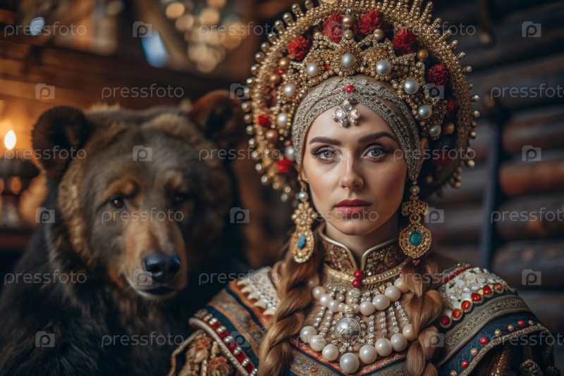 Красивая девушка в традиционном русском национальном костюме.Перед живым медведем.Портрет символизирует традиции и красоту русского народа