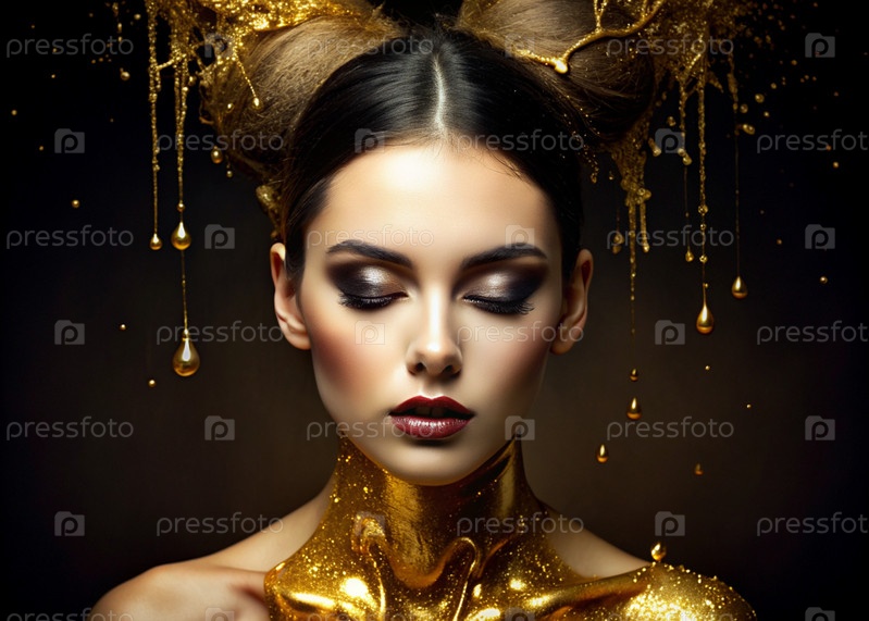 Творческий баннер для салона красоты в черно-золотых тонах. Профессиональный макияжный художник, стилист и парикмахер. Красивая женщина с вечерним гримом и золотыми рогами на голове. Индустрия красоты
