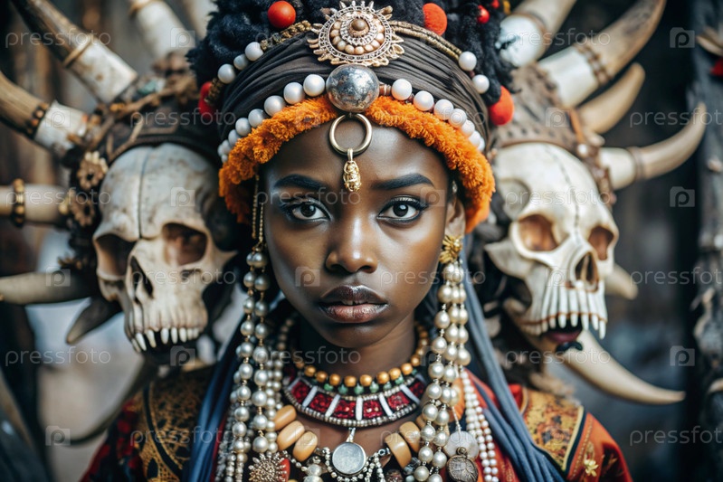Красивая африканская девушка в традиционном национальном костюме. с костями. портрет символизирует традиции, культуру и красоту африканского народа