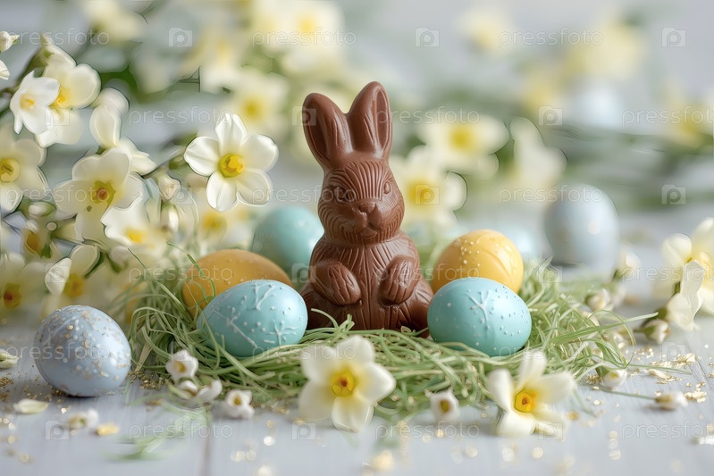 Шоколадное пасхальное яйцо, шоколадный кролик и весенние цветы на деревянном фоне. Пасхальные сладости и лакомства. Концепция яркого праздника Пасхи в 2026 году. Хорошая открытка