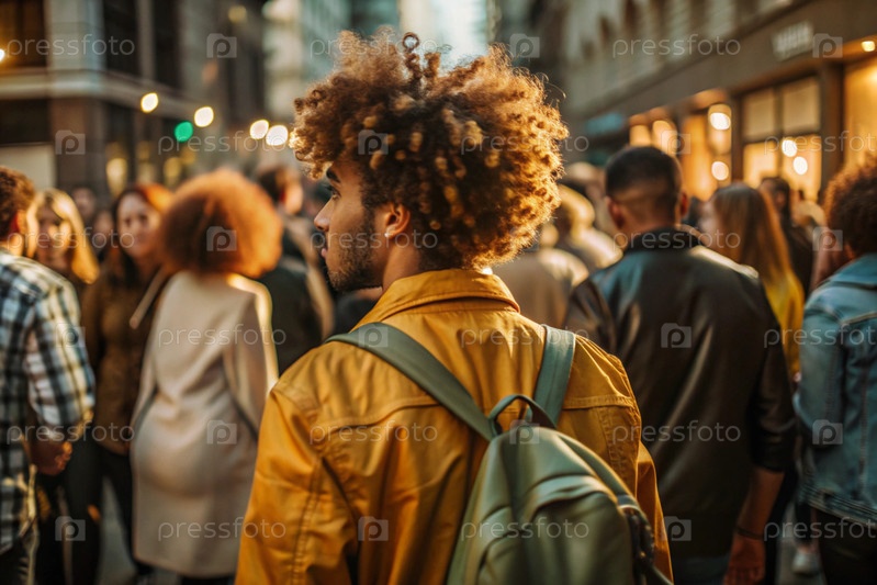 Портрет поднимающегося путешественника-мулата в желтой куртке и с рюкзаком по городу.Путешествие в одиночку - это образ жизни.Молодой турист наслаждается осенними каникулами