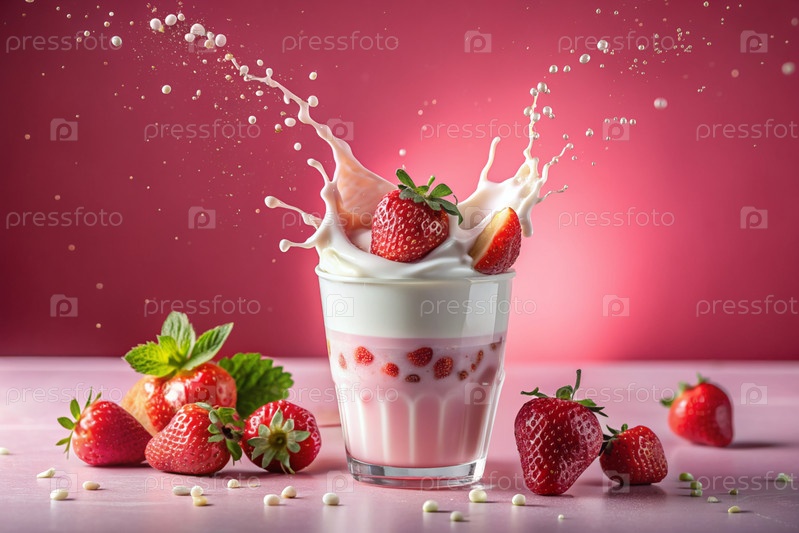 Творческий кулинарный рисунок. ближайшее наполнение клубники, клубника в стакане молока, розовый милкшейк, коктейль йогурта с жидкими каплями на розовом фоне