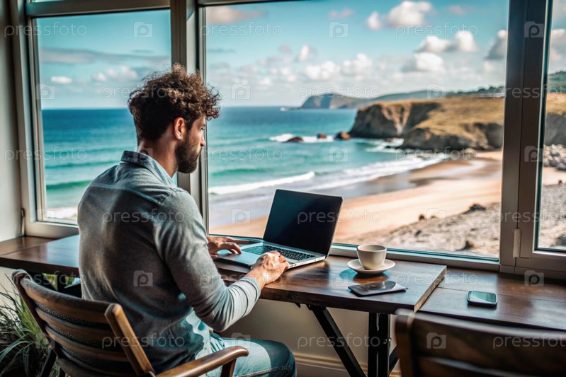 Молодой бизнесмен-фрилансер работает на ноутбуке, отдыхая у моря или делая покупки в Интернете