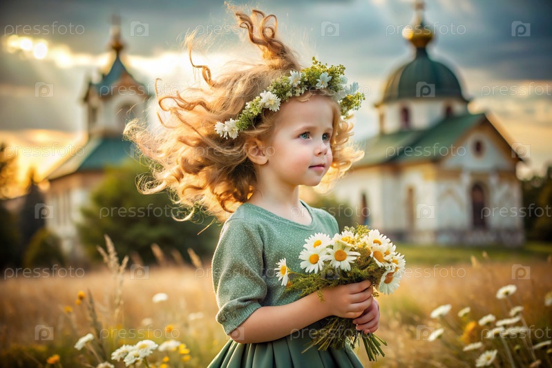 Всероссийский День семьи, любви и верности Красивая маленькая кудрявая девочка с букетом ромашек на фоне Православной церкви День святого Валентина Петра и Февронии