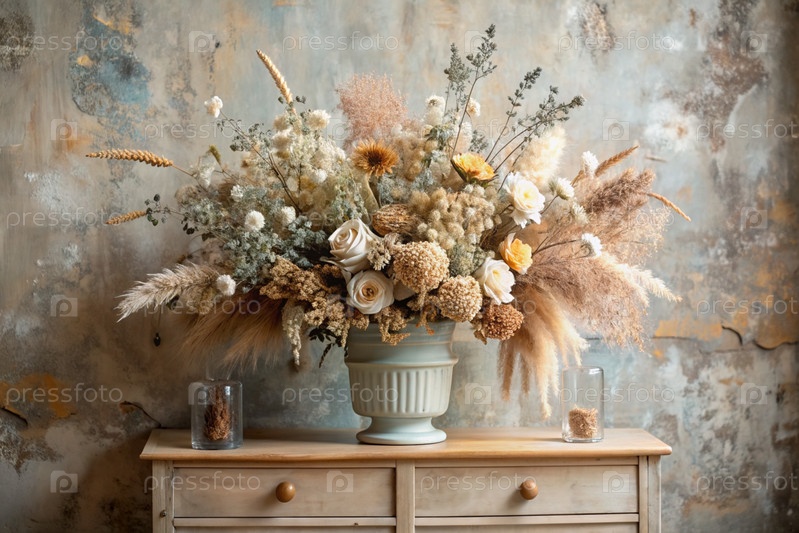 Красивый букет сушеных цветов в стеклянной вазе и флаконы на древнем деревянном шкафчике. Букет цветов в вазе во внутренней части дома. Светлый, бежевый, синий цветочный фон