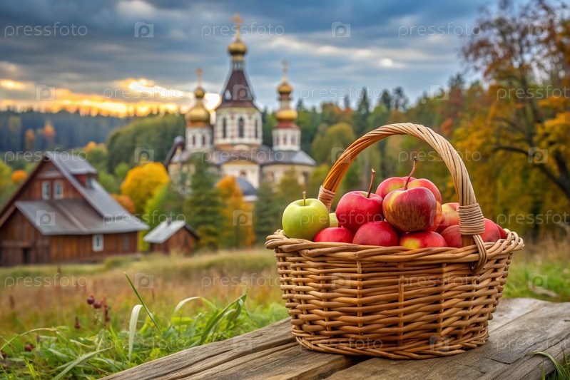 Концепция русского православного праздника Apple resort.Прекрасная плетеновая корзина из виноградных лоз с красными спелыми яблоками на фоне православной церкви