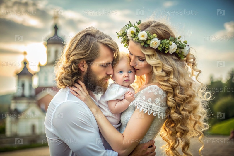 Всероссийский день семьи, любви, верности мужчина и женщина с ромашками с ребенком в руках на фоне православной церкви День святого Валентина Петра и Февронии