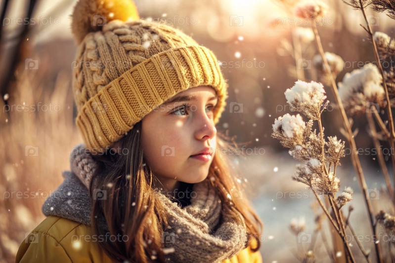 Зимний портрет. Близкий план молодой девушки в вязанной шляпе, шарфе и наружной куртке