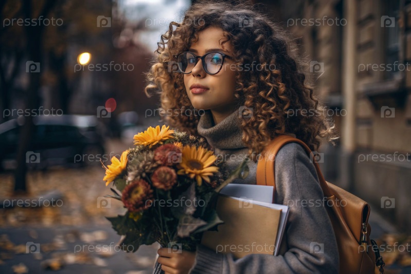 Красивая маленькая кудрявая девочка в очках и букете осенних цветов ходит в школу впервые. Ребенок со школьной сумкой, книгой и цветами. Малыш на городской улице. Возвращение к школе