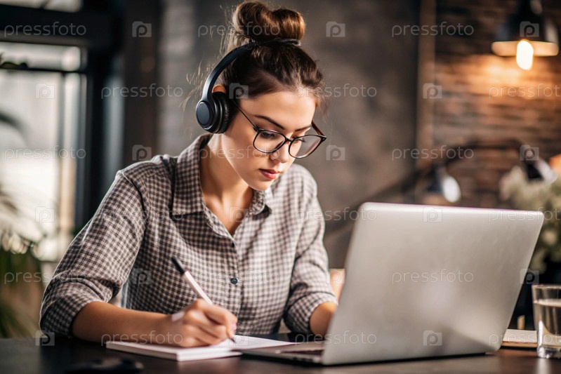 Молодая женщина фрилансер в очках и наушниках работает на ноутбуке или делает покупки в интернет-магазине