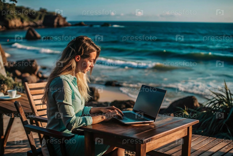 Молодая женщина-фрилансер работает на ноутбуке, отдыхая у моря или делая покупки в Интернете