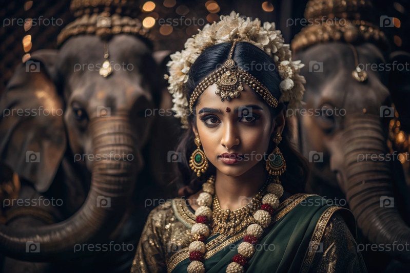 Красивая индийская девушка в традиционном национальном костюме, сари. со слонами. портрет символизирует традиции, культуру и красоту народа Индии