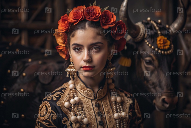 Испанская девушка в традиционном испанском национальном костюме. Перед быком. Бикоборство. Портрет символизирует традиции и культуру народа Испании
