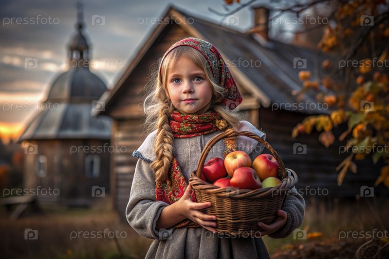 Красивая девушка в русской национальной одежде с корзиной спелых красных яблок на фоне православного храма