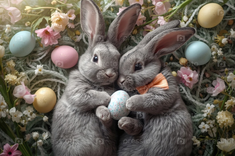 Пасхальные кролики лежат на пасхальных яйцах и смотрят в камеру. праздничная открытка или баннер. счастливая Пасхальная концепция в 2026 году