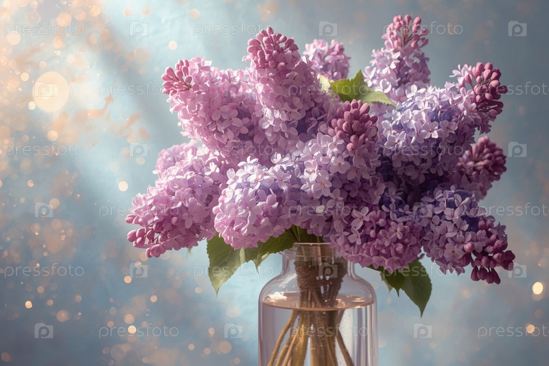 Букет нежных лиловых сирен в стеклянной вазе на голубом фоне. Цветы и почки в вазе. светло-фиолетовый, цветочный фон