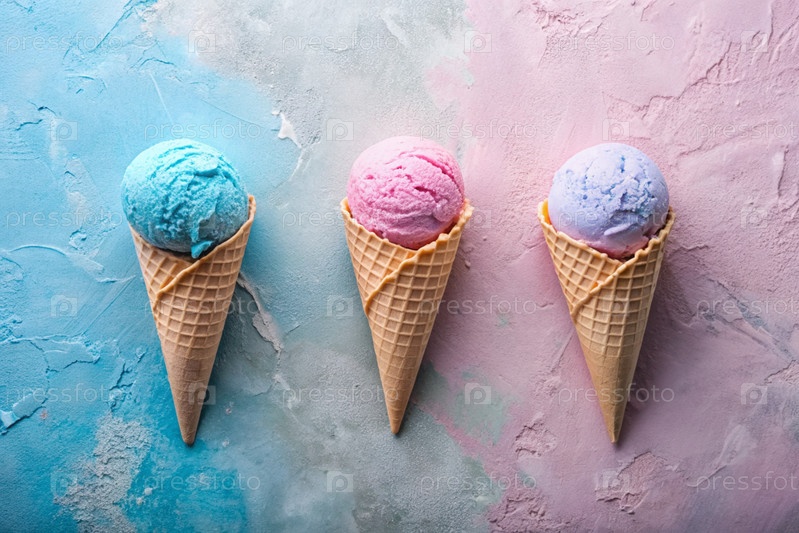 сладкий десерт. морозильные шишки разных вкусов. синий, розовый и фиолетовый мороженое на фоне трех пастельных цветов: синего, розового и фиолетового
