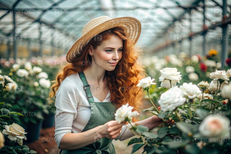 Портрет красивого садовника с рыжими волосами в соломенной шляпе, работающего с розами в стеклянной теплице