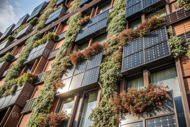 Новый жилой район с современными семейными новостройками, многоэтажное здание со солнечными батареями для электроснабжения и отопления фасадов