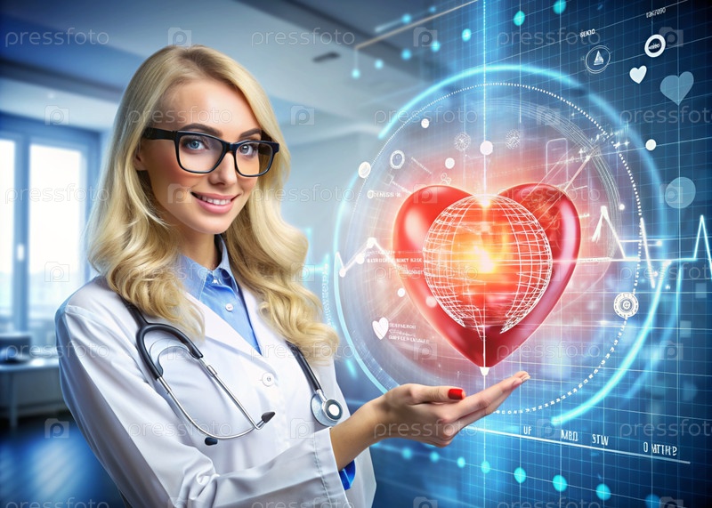 Медициной молодой красивой девушки является кардиолог с очками в кабинете со стетоскопом.Красные цифровые коды в виде частоты сердечных сокращений на виртуальном экране.Цифровые технологии будущего