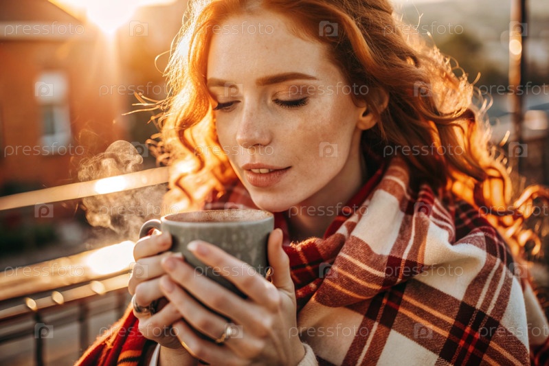 Красивая рыжеволосая женщина, завернутая в клетку с кружкой горячего кофе на красивом террасе под лучами заходящего солнца