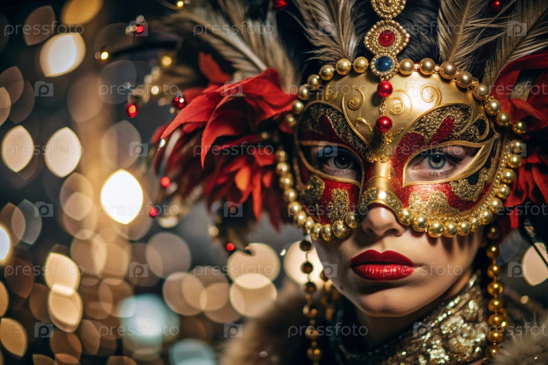 Карнавал Венеции.Закрытие женщины в украшенной карнавальной маске.Яркие цвета передают атмосферу празднования и роскоши