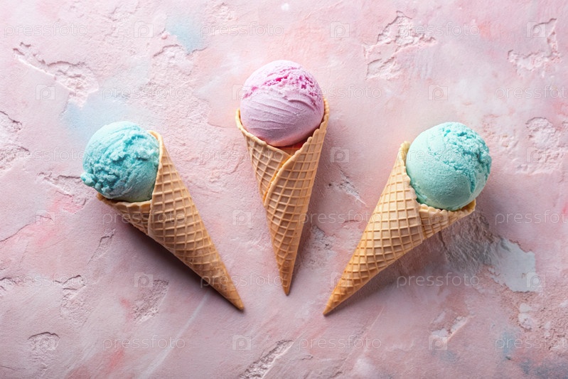 Баннер.Сладкий десерт.Конусы мороженого с разными вкусами.Голубое, розовое мороженое на фоне двух пастельных цветов: синего и розового