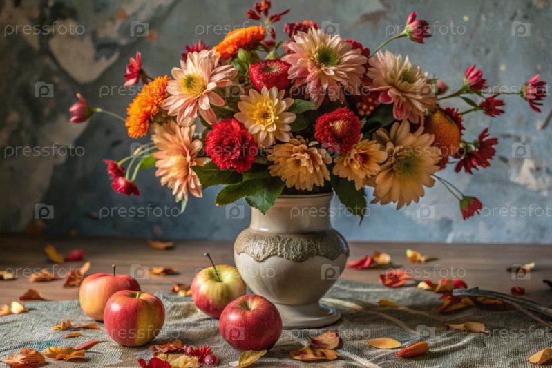 Красочное лето, осенний букет цветов различных красных, розовых, белых оттенков в вазе и спелые красные яблоки на столе