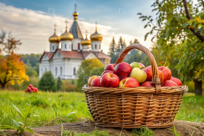 Концепция русского православного праздника Apple resort.Прекрасная плетеновая корзина из виноградных лоз с красными спелыми яблоками на фоне православной церкви
