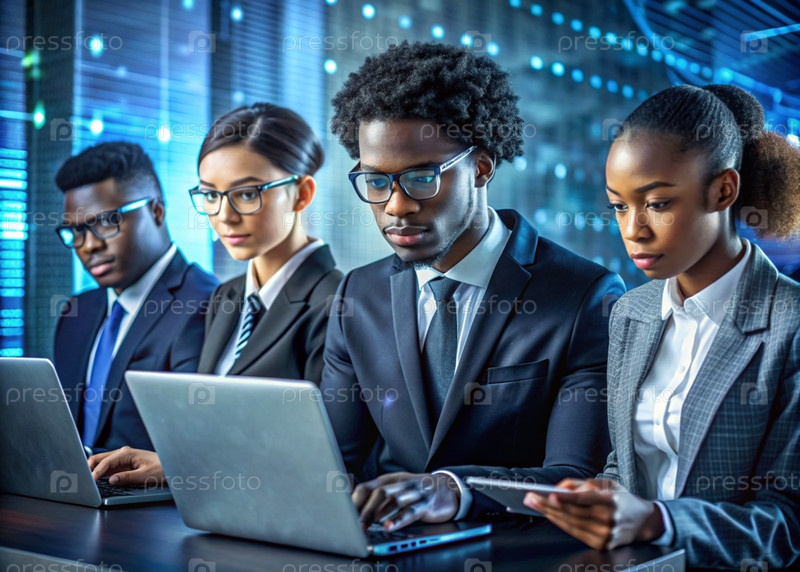 Молодые чернокожие мужчины и афроамериканки в костюмах работают в офисе за ноутбуком с цифровыми кодами на виртуальном экране