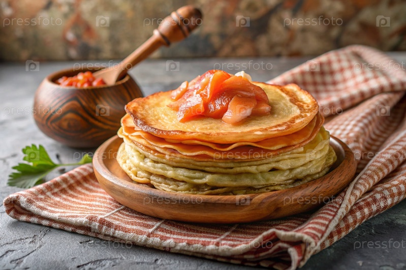 Вкусные блины с соленой красной рыбой.Концепция российского праздника Масленицы