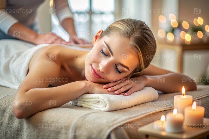 Баннер для профессиональных массажных салонов.Молодая, красивая блондинка наслаждается массажем в современном спа при свечах.Освобождение и гармония, уход за телом