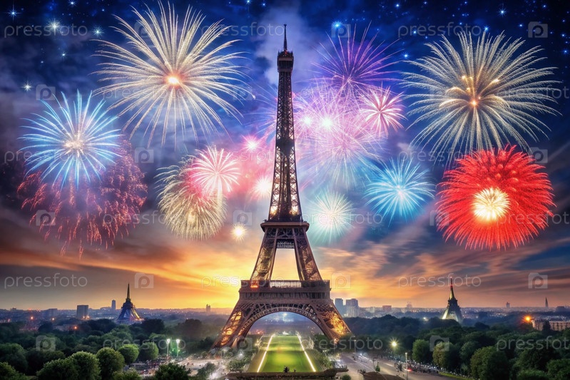 14 июля - Национальный день Франции. Государственный флаг Франции против Эйфелевой башни. Фейерверк, фейерверк против ночного неба. Триколор