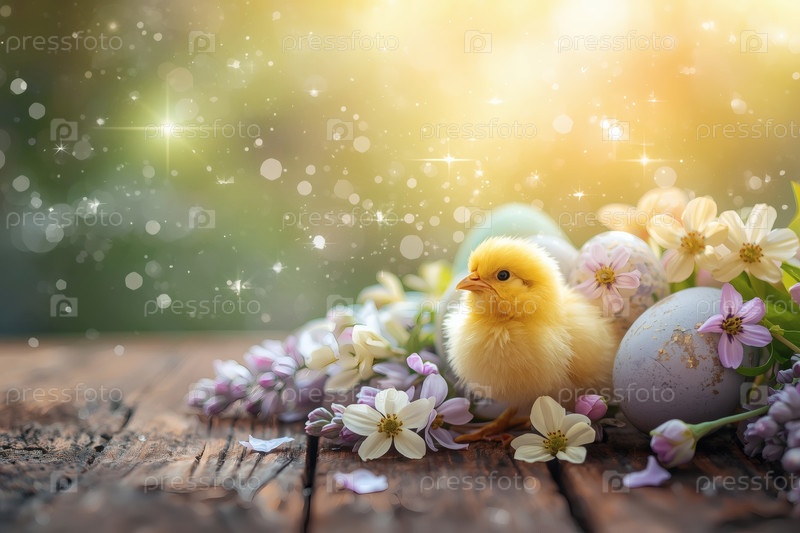 Пасхальные яйца, желтая курица и весенние цветы на деревянном фоне. Концепция яркого пасхального праздника в 2026 году