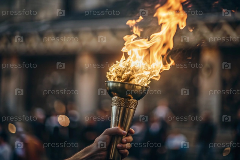 Пламя олимпийского факела горит в его руке среди красивой размытой стороны