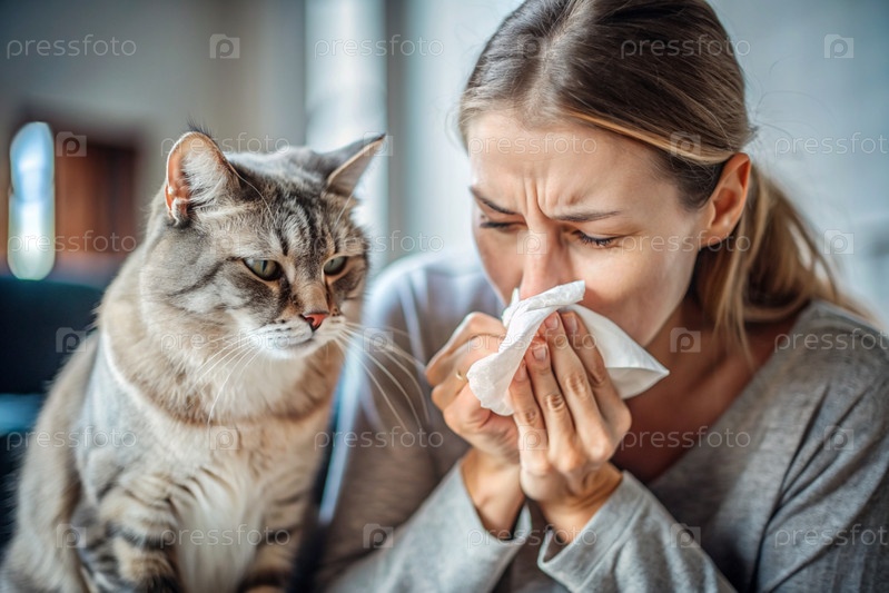 Женщина чихает в белую салфетку дома. Аллергия на волосы кошек и домашних животных. Рядом со мной кот