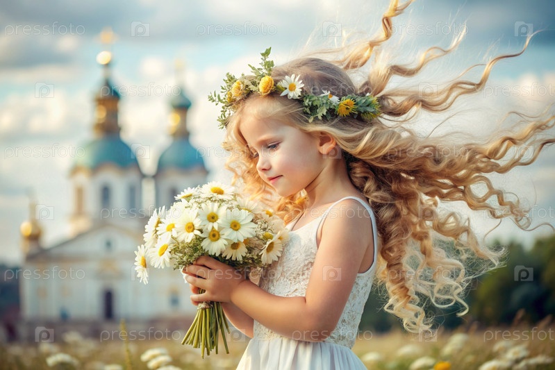 Всероссийский День семьи, любви и верности Красивая маленькая кудрявая девочка с букетом ромашек на фоне Православной церкви День святого Валентина Петра и Февронии