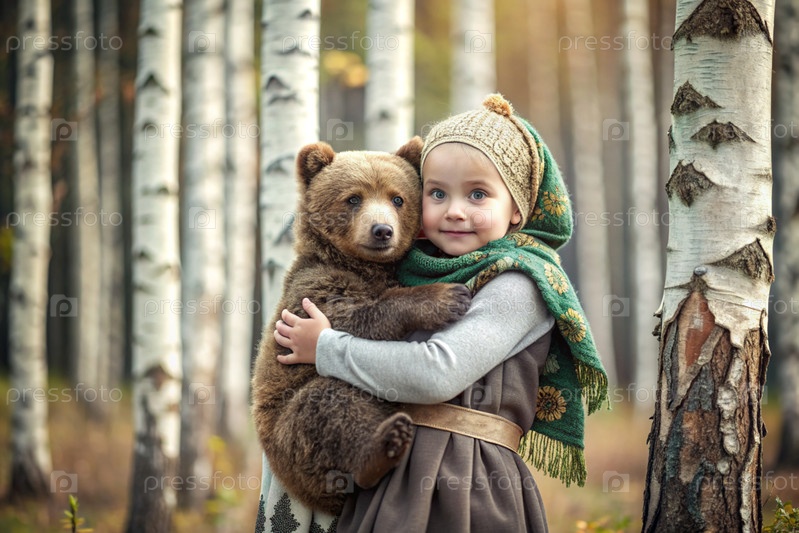 Красивая маленькая девочка в русской народной одежде и с платками на голове в березовой роще с живым медведем Русский фольклор, славянская мифология