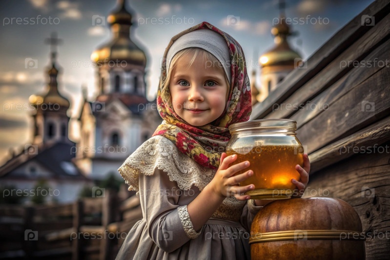 Концепция российского православного праздника 'Мед Спаситель' - красивая маленькая девочка в русской национальной одежде и шарф с баночкой меда на фоне православной церкви