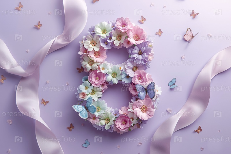 Международный женский день. баннер, флаер, красивая открытка на 8 марта. цветы в форме цифры восемь и бабочки на лиловом фоне