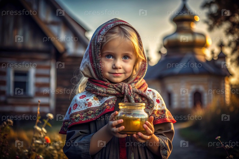 Концепция российского православного праздника 'Мед Спаситель' - красивая маленькая девочка в русской национальной одежде и шарф с баночкой меда на фоне православной церкви