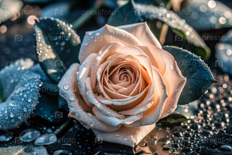 Кремовая роза красивого цвета кофе или шампанского, покрытая росой на рассвете. Красивое солнечное сияние. Фон изображения выполнен в зеленых и бежевых тонах. Естественный, экологически чистый естественный фон