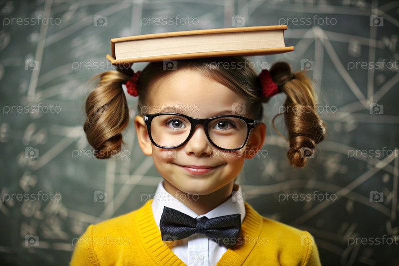 Красивая девушка с очками и книгами на голове. Ребенок впервые идет в школу. Ребёнок в классе со доской на заднем плане. Возвращение к школе