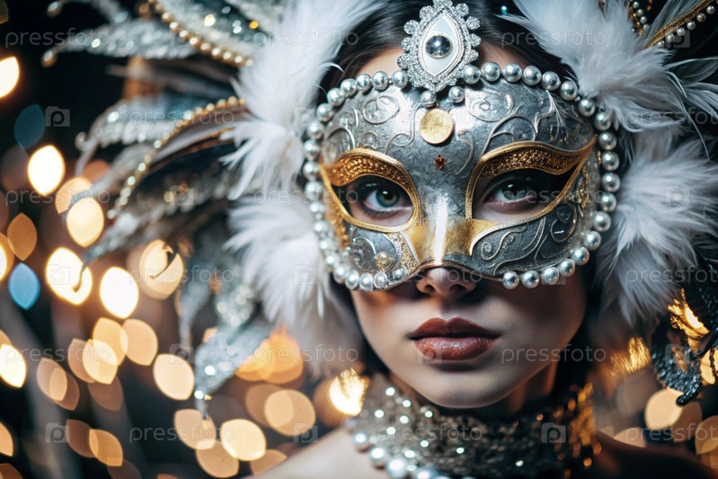 Карнавал Венеции.Закрытие женщины в украшенной карнавальной маске.Яркие цвета передают атмосферу празднования и роскоши