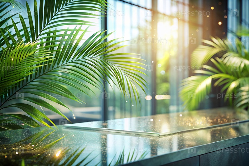 Минимальный фон для демонстрации продукта.Современная стеклянная трибуна со стеной из стекла и пальмовых листьев.Элегантный дизайн для презентации продукции