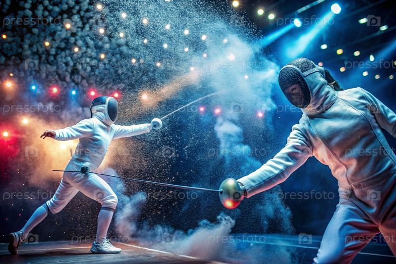 Фехтовальщики на арене с рапирами в руках во время тренировок дерутся в дуэли. Спортивное фехтование. Фехтование является типом летних Олимпийских игр