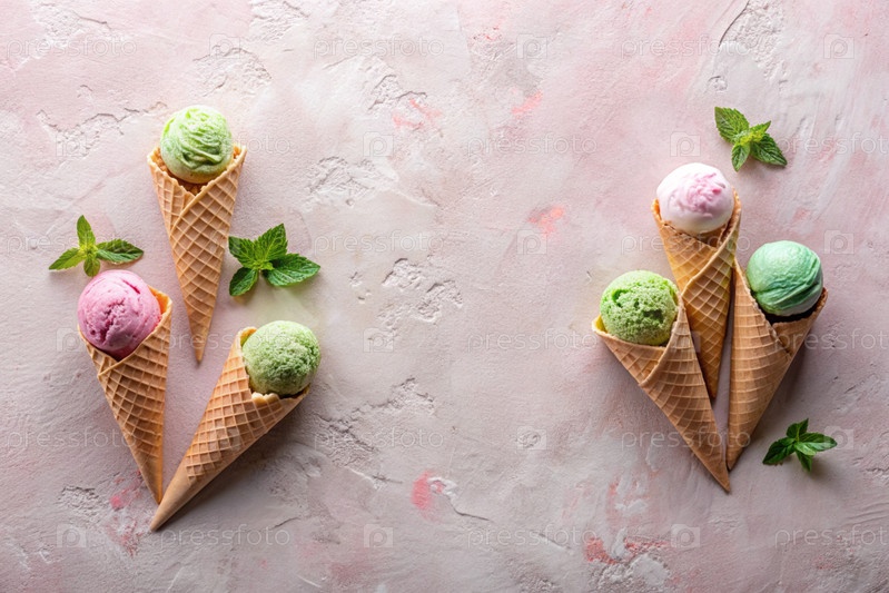 сладкий десерт. морозильные шишки с различными вкусами на бетонном розовом фоне. Всемирный день мороженого