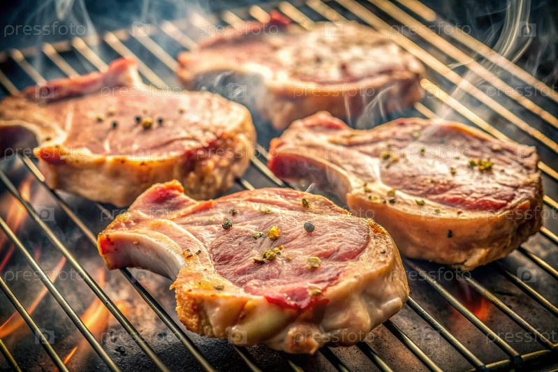 Жареное мясо, копченое свиное стейки, жареное копченное мясо. Барбекю в коттедже. Майские праздники. Барбекю на природе. Процесс приготовления мяса на гриле, крупный план