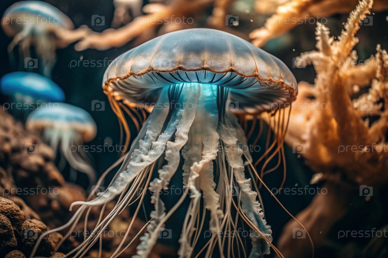 Скуба дайвинг. Дайвинг. Красочные медузы плавают в тропических водах. Медузы в подводном мире диких животных. Наблюдение за океанической фауной