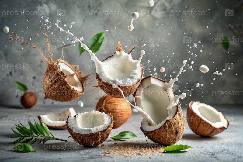 брызги кокосового молока и пальмовых листьев. Брызги молока - кокосы на сером фоне. Баннер для сладостей, курортной косметики или кремов по уходу за телом и лицом